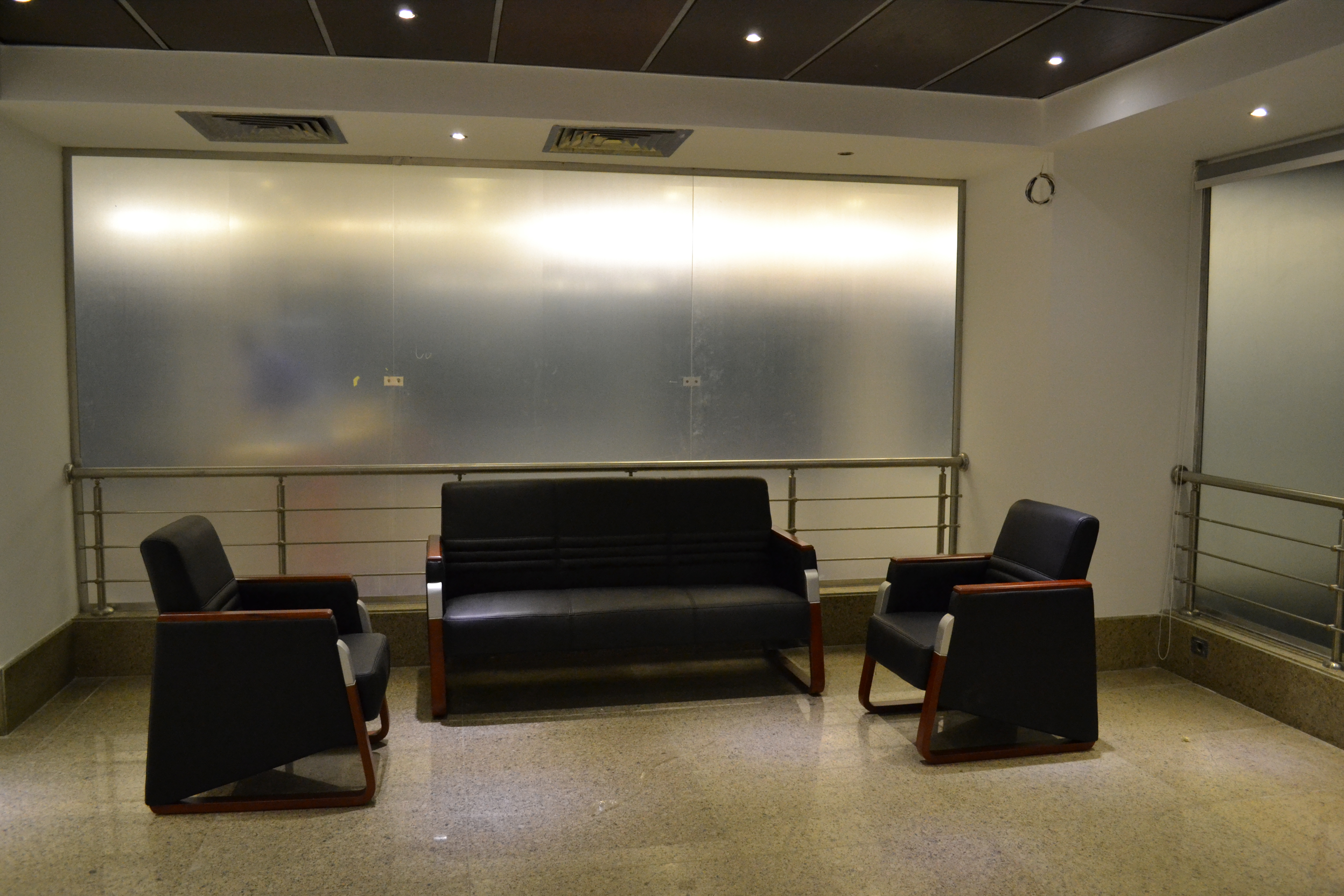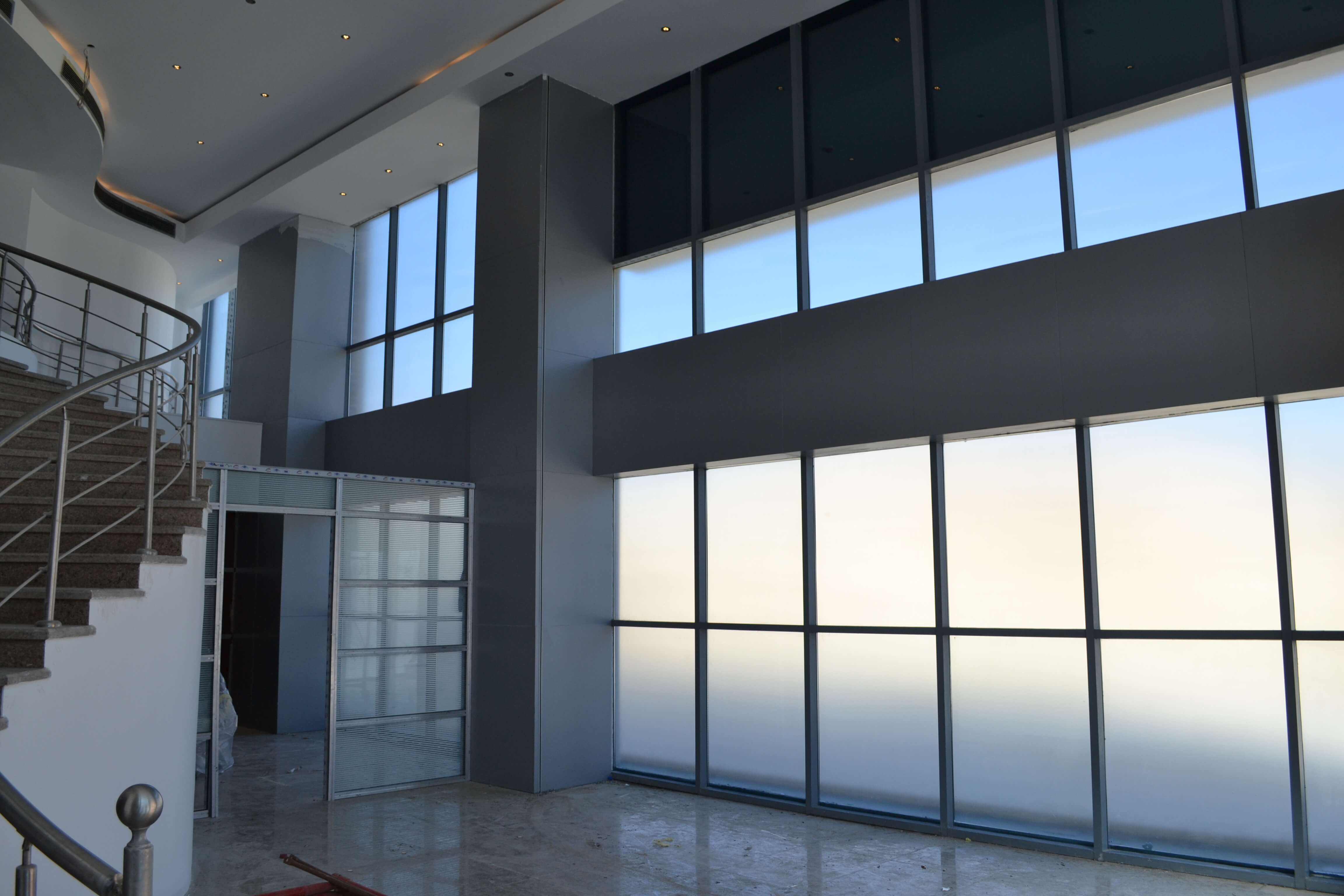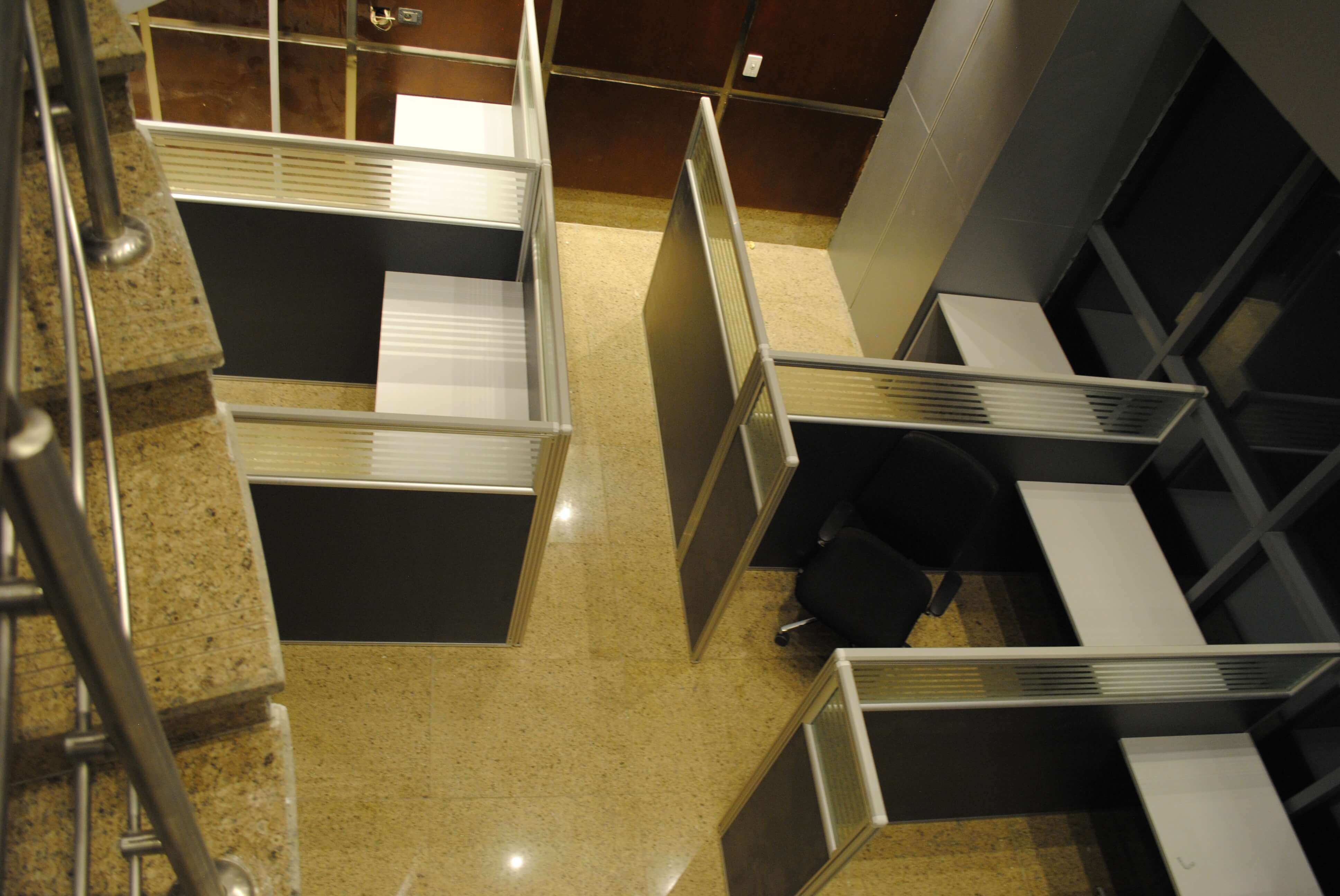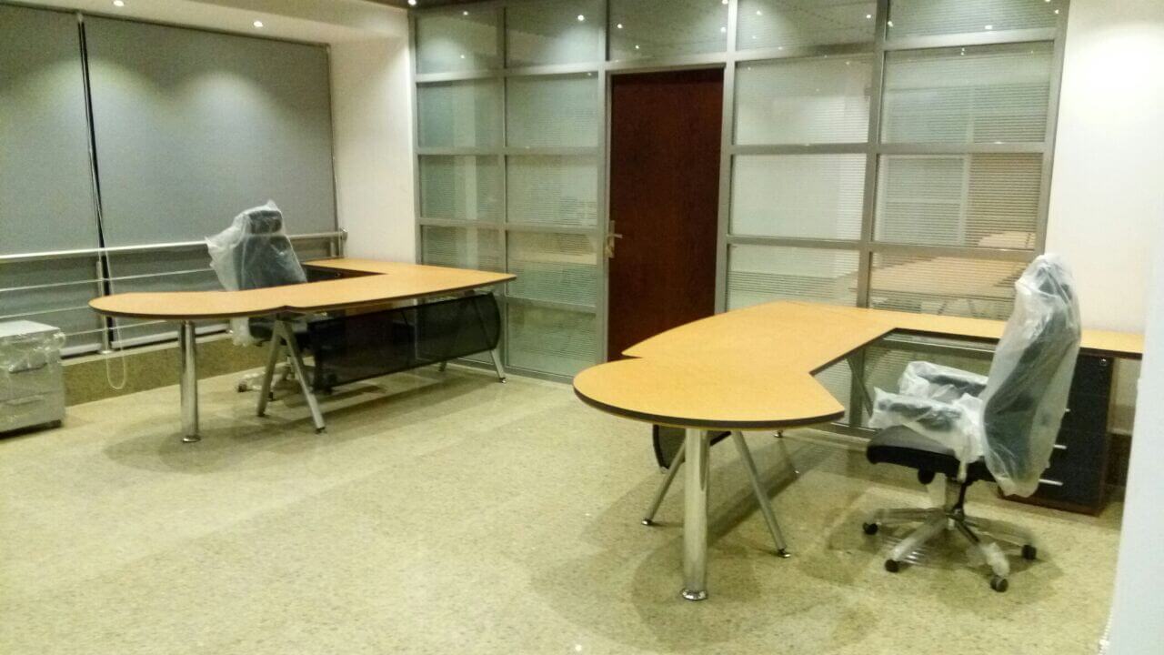 Curtain wall partitions. Furnishing included : Fabrication & Supply of : Reception desk,Meeting room table, Manager desks, Cubicals, desk chairs, waiting area furniture.