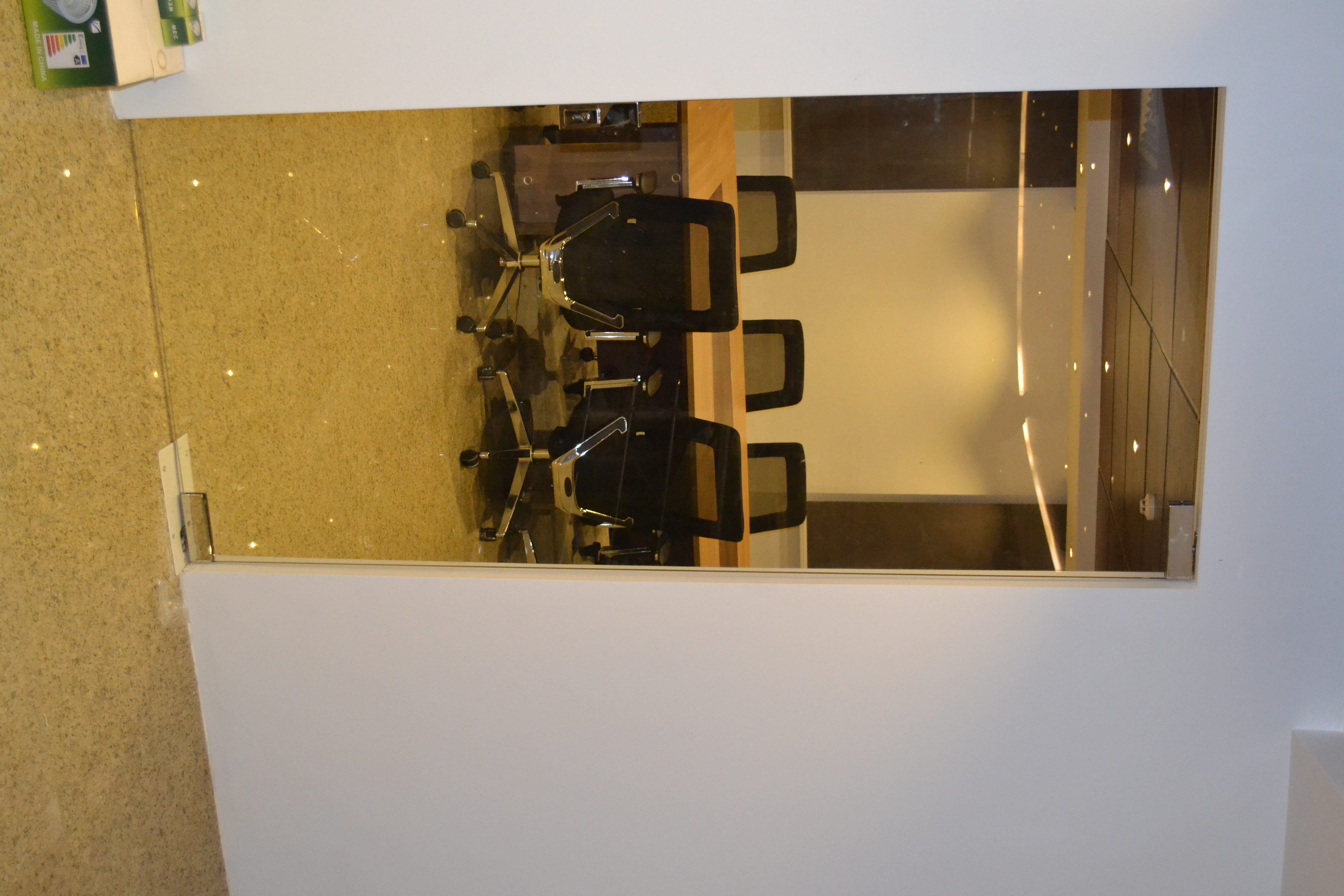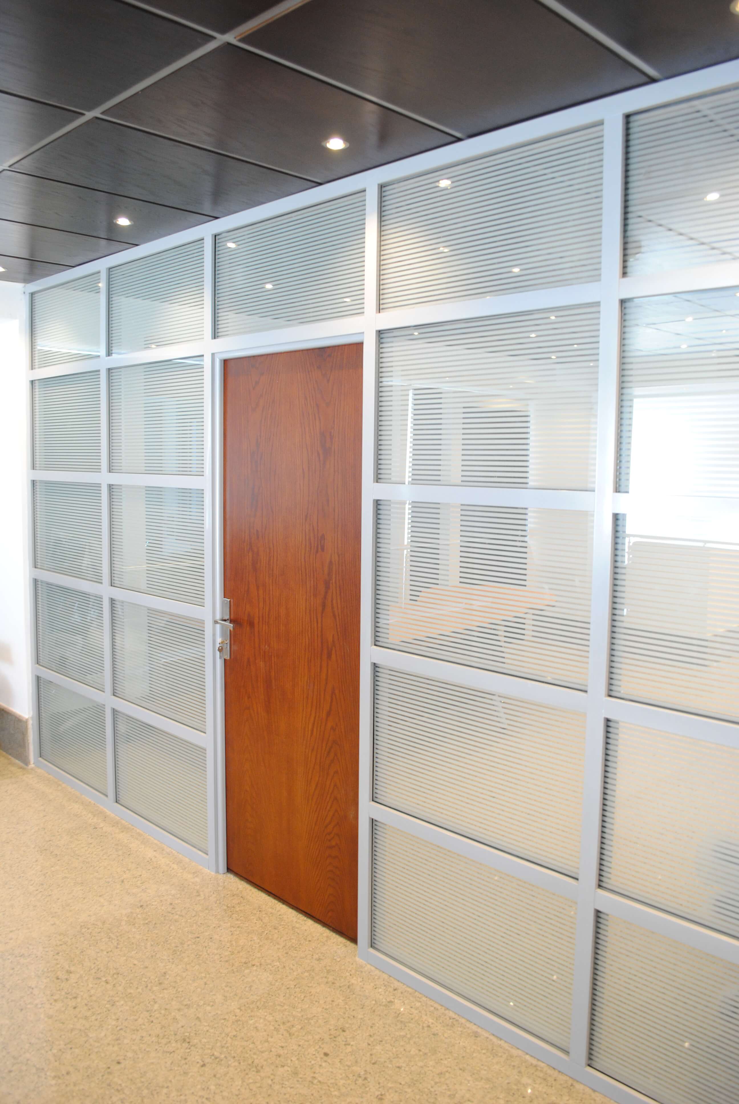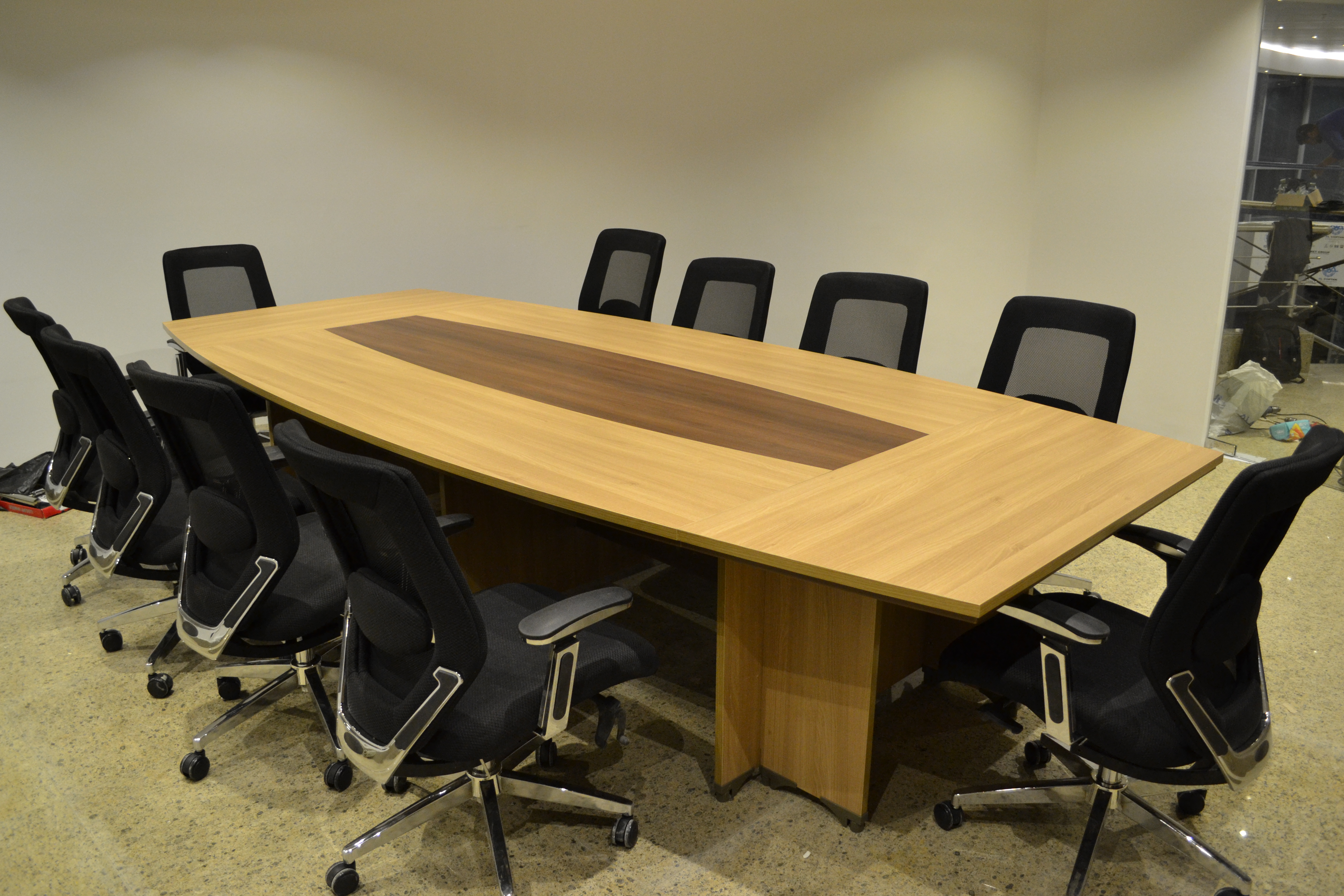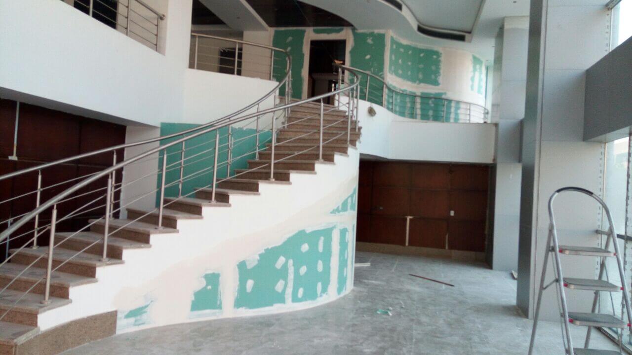 Curtain wall partitions. Furnishing included : Fabrication & Supply of : Reception desk,Meeting room table, Manager desks, Cubicals, desk chairs, waiting area furniture.
